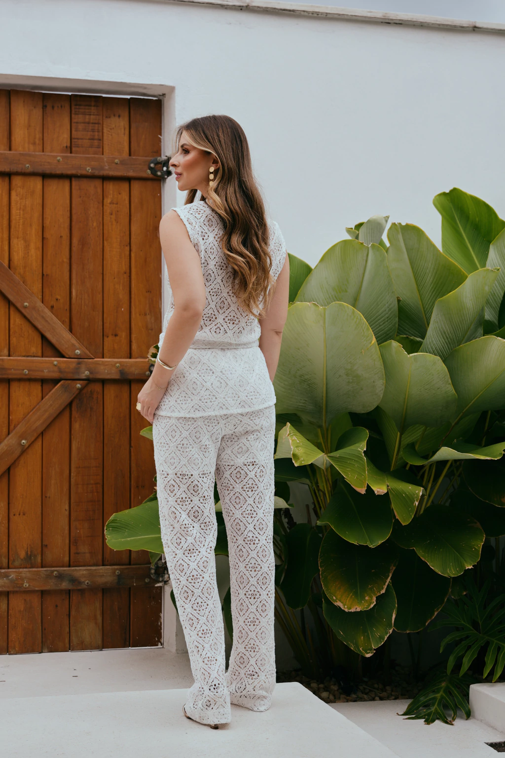 Descubra o charme deste conjunto composto por calça e camiseta em renda delicada, que exala elegância e leveza. A calça vem com forro em short para evitar transparências, garantindo conforto e segurança mesmo nos dias mais quentes. O toque final fica por conta do cinto com fivela dourada em metal, que acintura e valoriza a silhueta com refinamento.