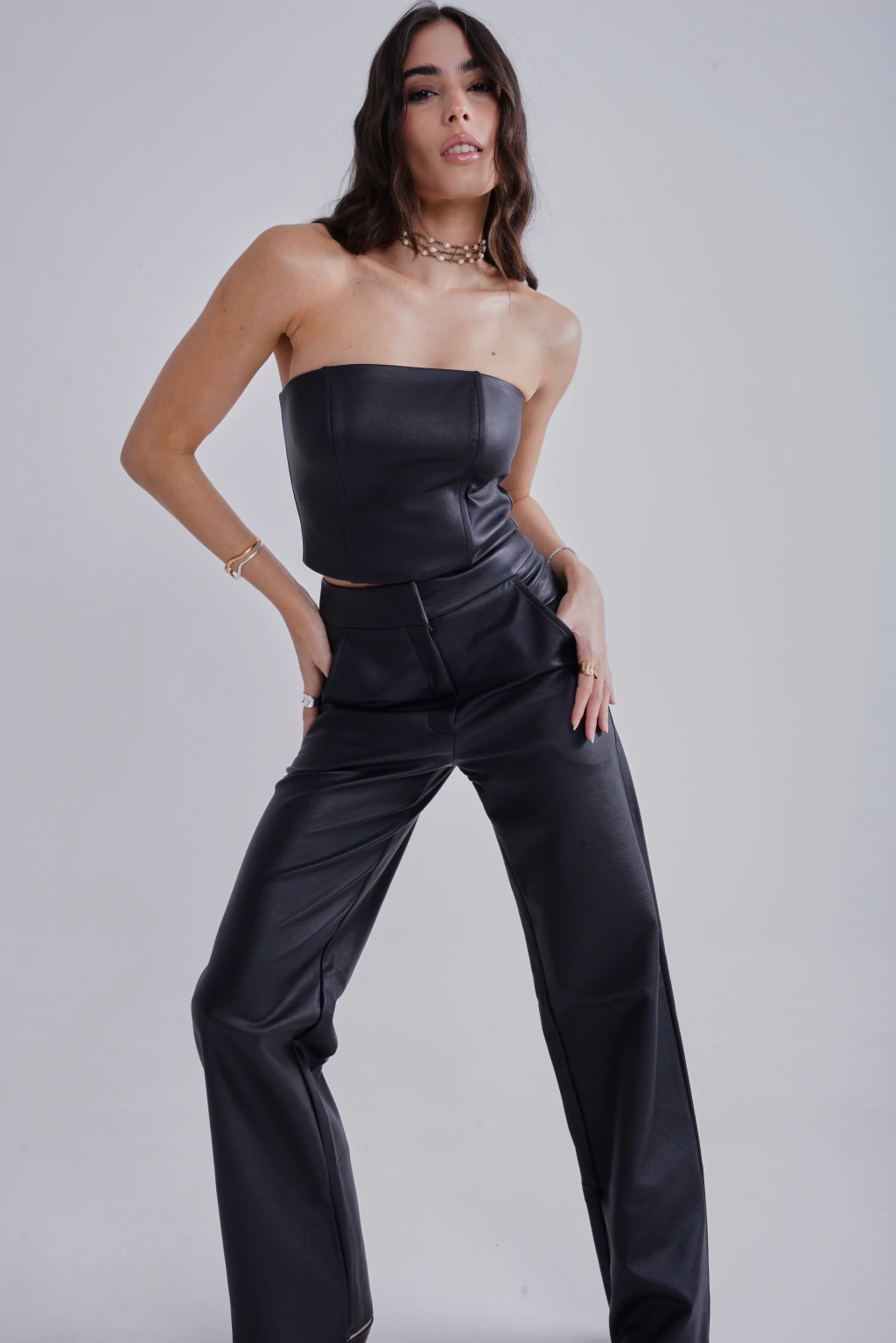 COMO USAR: O nosso corsset pode ser usado de diversas formas. Fica lindo com a nossa saia , calça ou saia midi, também em couro. É uma peça estilosa e super fácil de criar combinações.